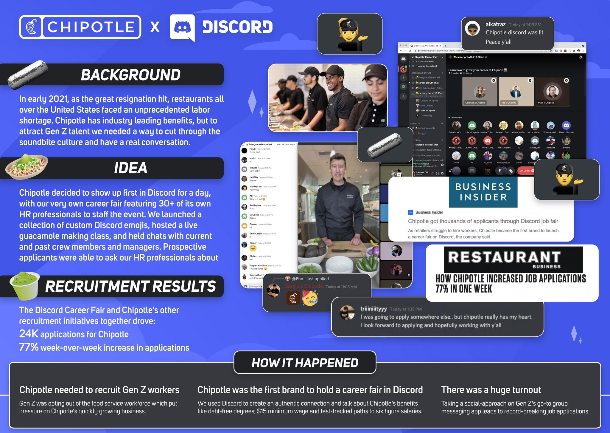 Brand Spotlight: Chipotle’s Virtual Career Fair In 2021, Chipotle leveraged Discord to host a virtual career fair, becoming one of the first major brands to do so. This innovative approach led to a 77% increase in job applications week-over-week and garnered significant media attention.